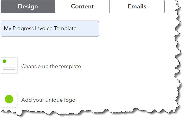 Now you have to modify the invoice template to accommodate progress invoicing. Click the gear icon in the upper right again and then click Custom form styles under YOUR COMPANY. Open the New style menu in the upper right and select Invoice. Your default template will appear in the box under Design/Content/Emails. Replace that name with a new descriptive name so you don’t overwrite your default invoice settings. Click Change up the template.