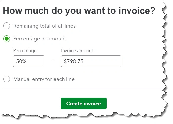 You would choose the first option if you’ve already partially processed the invoice and are ready to close it out. The second option allows you to just enter a flat percentage of the invoice total to include. If you choose the third, the invoice that opens will have zeroes in the Due column.